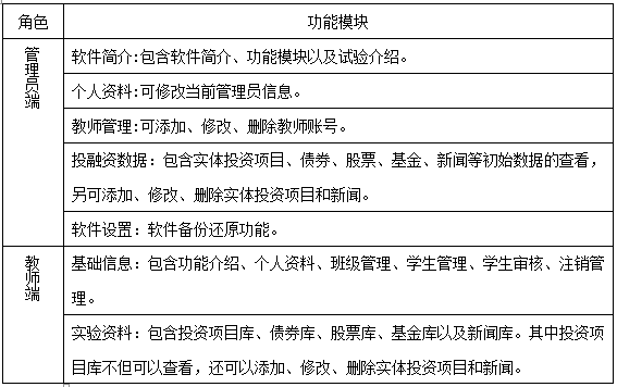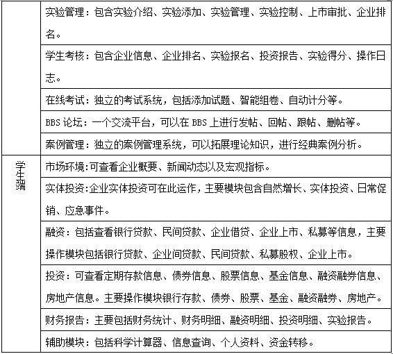投(tou)融(rong)資(zi)(zi)(zi)決策(ce)實驗是由(you)學(xue)生扮演各種企(qi)業(ye),教師給定企(qi)業(ye)的初始資(zi)(zi)(zi)金,分為固(gu)定資(zi)(zi)(zi)產(chan)和(he)流(liu)動(dong)資(zi)(zi)(zi)金兩(liang)部分,學(xue)生可以合理(li)分配流(liu)動(dong)資(zi)(zi)(zi)金,利用(yong)銀行存款(kuan)、銀行貸(dai)款(kuan)、債(zhai)券、股(gu)票、基金、融(rong)資(zi)(zi)(zi)融(rong)券、房地產(chan)、企(qi)業(ye)間(jian)貸(dai)款(kuan)、民(min)間(jian)貸(dai)款(kuan)、私募(mu)股(gu)權、企(qi)業(ye)上市等投(tou)融(rong)資(zi)(zi)(zi)手段(duan),積累實體投(tou)資(zi)(zi)(zi)資(zi)(zi)(zi)金。